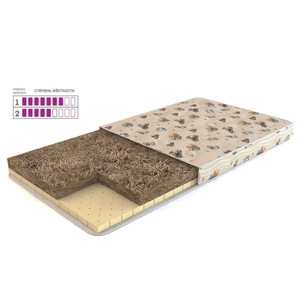 Матрас имеет высокую степень жесткости. Многослойный. При изготовлении использованы: натуральный латекс и кокосовая койра. Ткань - поликоттон