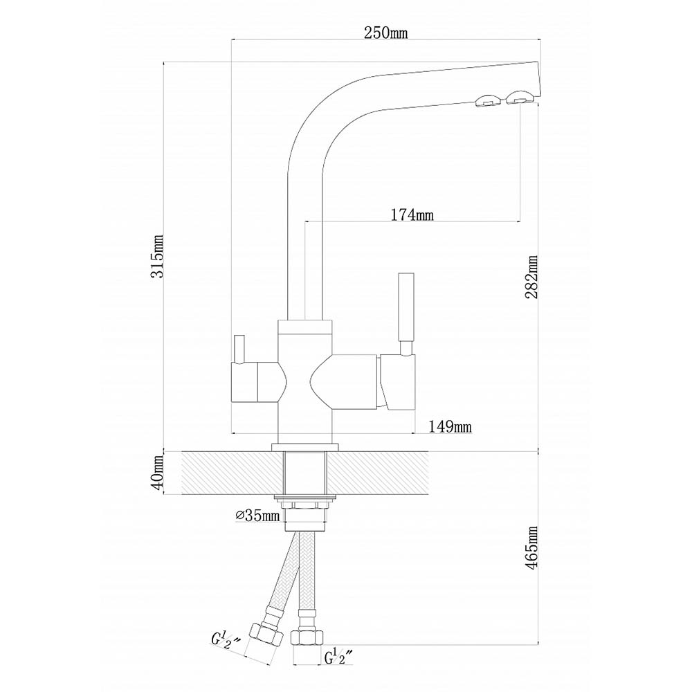 Дополнительный выход на изливе, снабженный собственным аэратором, для фильтрованной питьевой воды. В боковой части смесителя находится дополнительный кран для пуска фильтрованной воды.