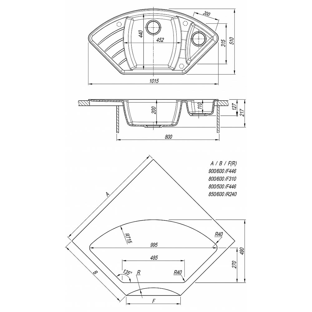 Практичная угловая мойка. Увеличенная основная чаша. Гармоничный дизайн. Угловая мойка с четкими контурами. Углубленное крыло. Гармоничный дизайн. Комплектация: Отводная арматура для двух разноуровневых чаш свыпусками 3 1/2 (D=90мм) и переливом.