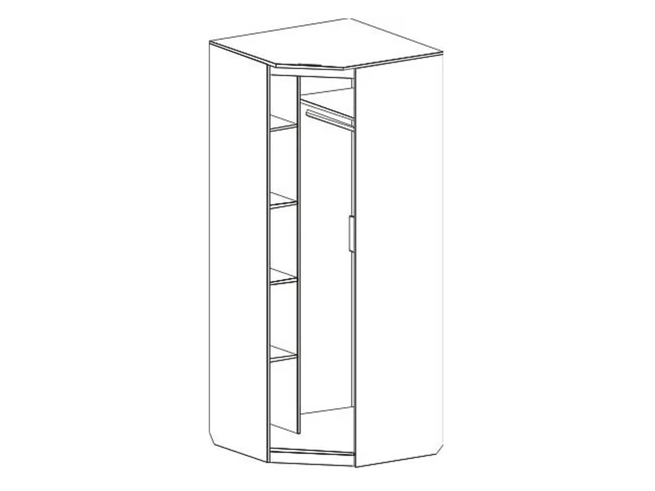 Угловой шкаф оснащен двумя отделениями: для белья с четырьмя жёсткими полками; платяное с жесткой полкой и продольной стальной штангой. В колпаке шкафа имеется паз для светильника, входящего в комплект. Блок питания приобретается отдельно, и рассчитан на подключение шести светильников.